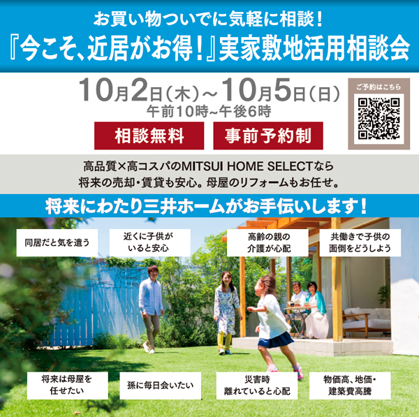 【お買い物ついでに気軽に相談!『今こそ、近居がお得!』実家敷地活用相談会のご予約はこちらから!】