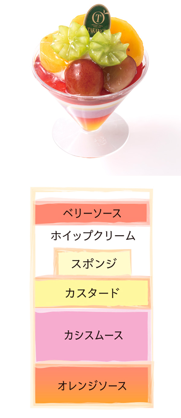 オレンジソースにカシスムース、ホイップクリーム、ベリーソースを重ね、秋の果実を飾った季節のパフェ。