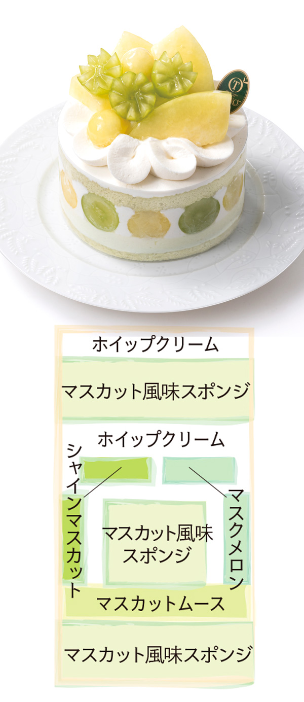 マスカット風味のスポンジ、マスクメロン、シャインマスカットで仕立てた季節のデコレーションケーキ。