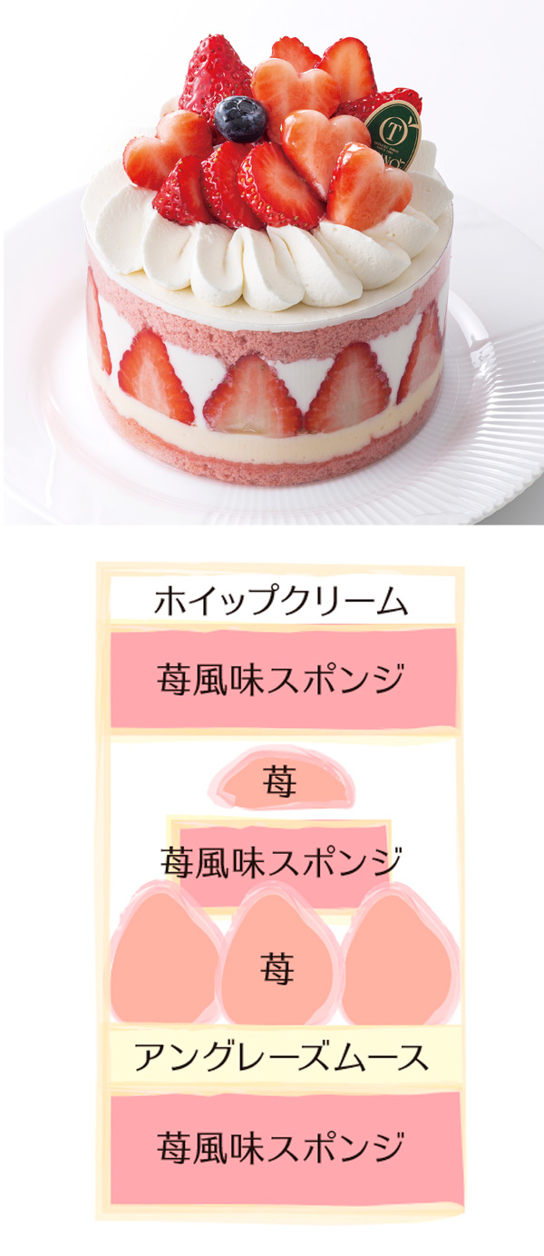 苺風味のスポンジで苺をサンドし、可愛らしく苺を飾ったアニバーサリーケーキ。