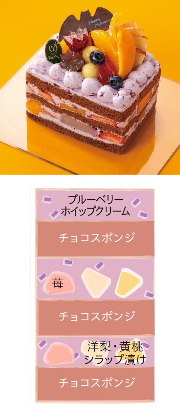 チョコスポンジにブルーベリーホイップ、苺、洋梨と黄桃のシラップ漬けをサンドしたハロウィン限定のケーキ。
