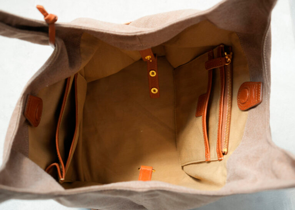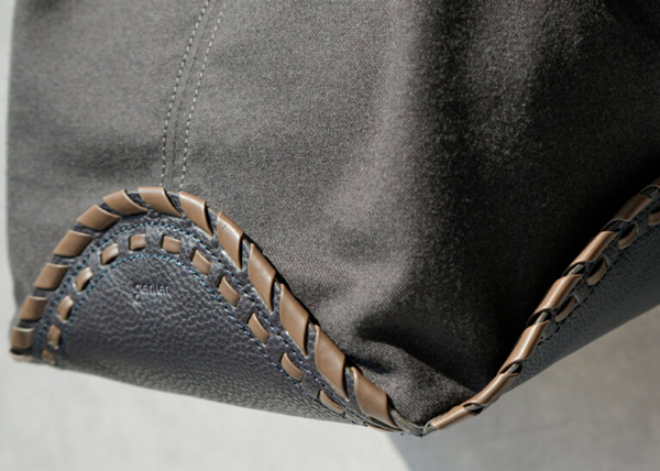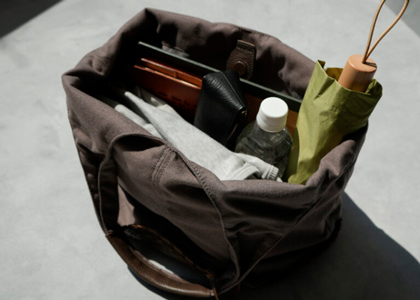 本革とユーカリ由来の布地を組み合わせたトートバッグ。上質な素材の確かさと、肩の力を抜いて
