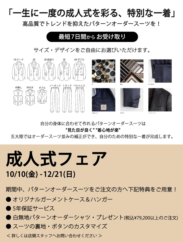 五大陸ではオーダースーツ並みの補正ができ、自分のための特別な一着が完成します。