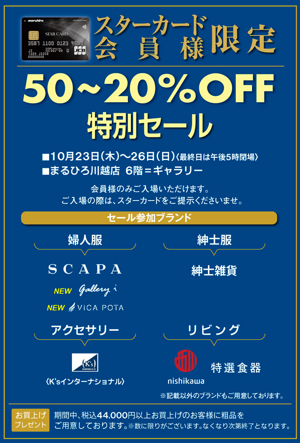 婦人服、西川寝具、特選食器、アクセサリー、紳士雑貨など会場内特別価格でご用意しております。スターカード会員様のみご入場いただけます。当日入会でもご入場できますので、ぜひこの機会にご入会くださいませ。