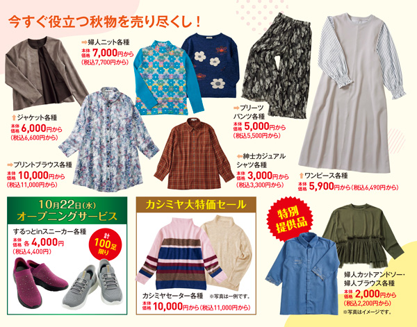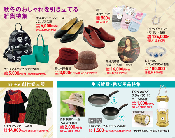 今すぐ役立つ秋物の婦人服や秋冬を引き立てるバッグや靴、生活雑貨や防災用品などお買い得価格にて多数取り取り揃えております。