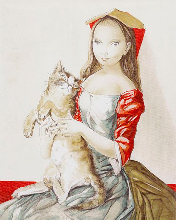 「猫を抱いた頭巾の少女」2014年 限定300 リトグラフ 45x36cm....本体価格260,000円(税込286,000円)