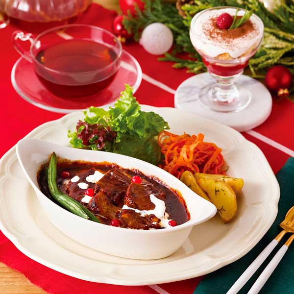 赤ワインを効かせたブラウンソースのビーフシチューをベシャメルソースと合わせてドリア仕立てに。キャロットラペとローズマリーポテト、ベリーのティラミスのクリスマス限定セット。