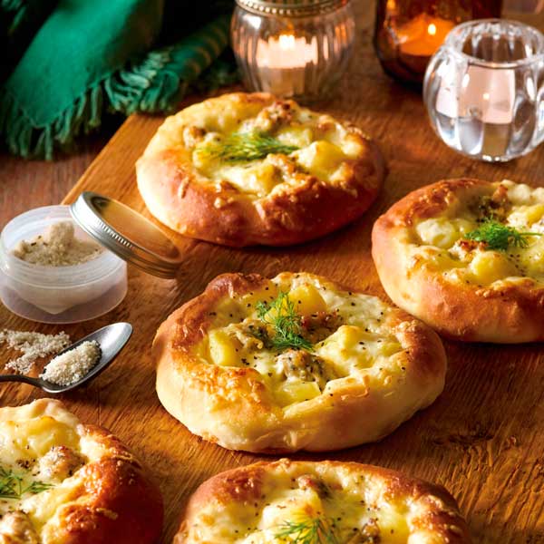 ベシャメルソースに、きたあかり、サルシッチャ、チーズをのせて焼き上げました。黒トリュフ塩を合わせ風味豊かに仕上げました。