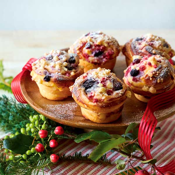 カスタードとラズベリージャムを巻いて焼き上げました。ブルーベリー、ストロベリー、ラズベリー、クランベリーとシュトロイゼルをトッピング。