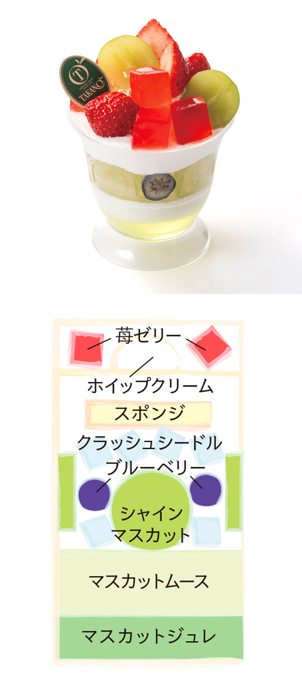 マスカットジュレにマスカットムースを重ね、苺ゼリー、シャインマスカット、苺で仕立てたパフェ。