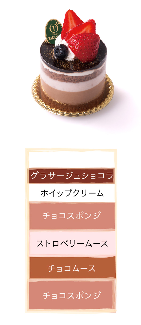 チョコスポンジにチョコムース、ストロベリームース等を重ね、フルーツを飾りました。