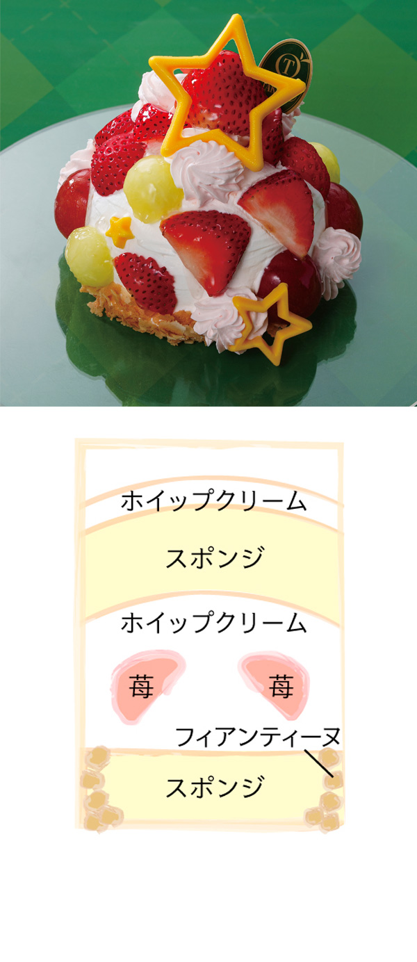 苺サンドのショートケーキにフルーツを飾りつけてツリーに見立てました。