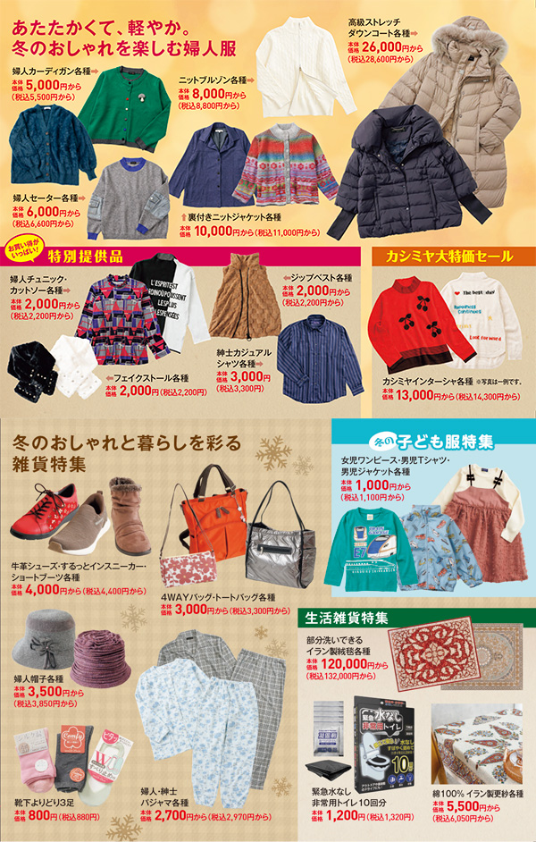 冬のおしゃれと暮らしを彩る婦人服や靴・バッグ、防災グッズやイラン製絨毯など取り揃えております。