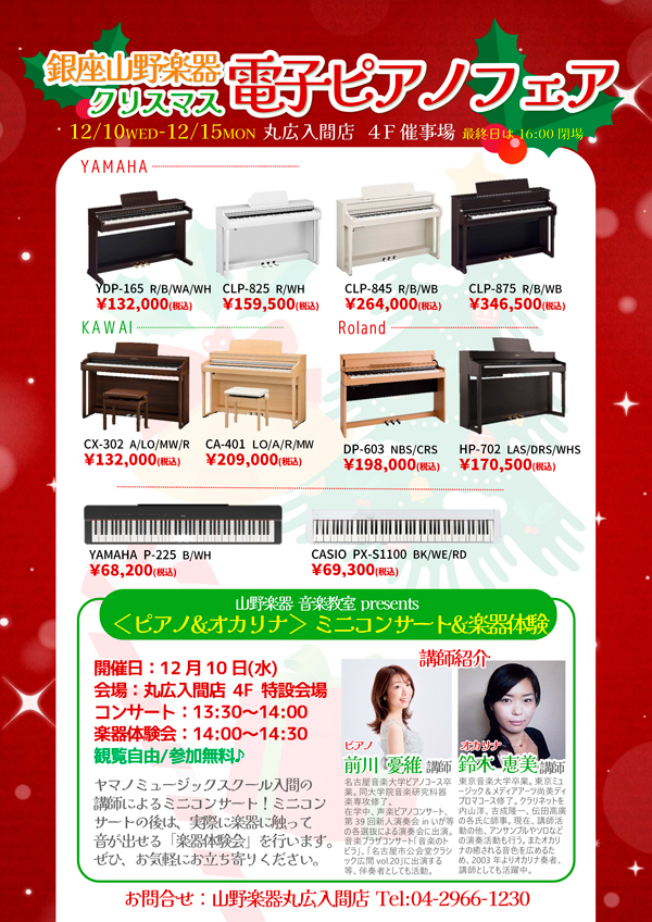 また、12月10日(水)13:30〜ヤマノミュージックスクールの講師による「ピアノ&オカリナ」ミニコンサートも開催!観覧無料!お誘いあわせの上ご来店ください♪みなさまのご来店を心よりお待ちいたしております。