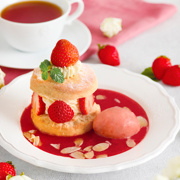 バニラビーンズ入りのさっくりふわっと食感のスコーンにフレッシュ苺、レモンミルクホイップをサンドしました。ストロベリージェラート、甘酸っぱい苺のソースとともに。
