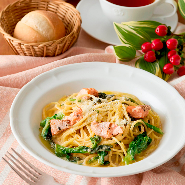 明太子にアンチョビ、パルメザンチーズを加えたソースに、サーモンと菜の花を合わせました。柚子オイルがアクセント。