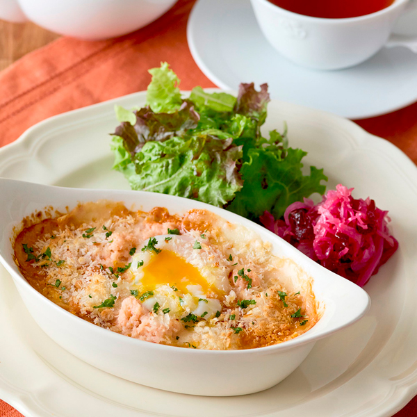 甘みがありジューシーな紅ずわい蟹と、オイルで蒸し焼きにした長ネギを加えたベシャメル、バターライスを重ね、半熟卵をトッピングして焼き上げたチーズドリア。イタリア産スモークオリーブオイルが香りのアクセント。