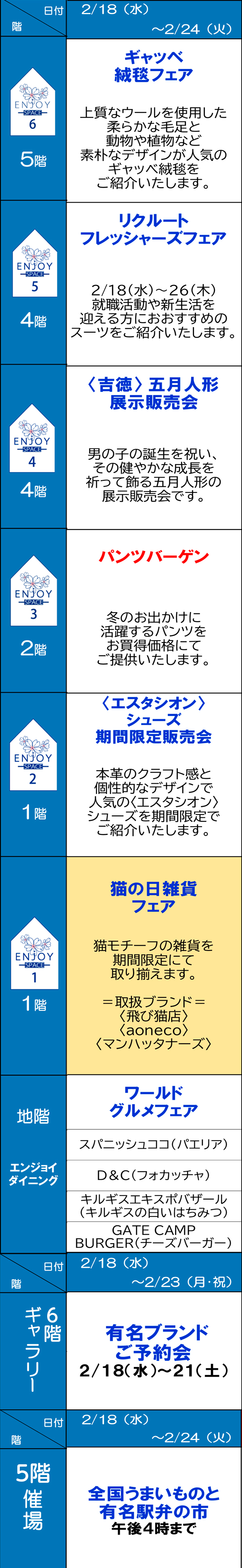 ●川越店 1階=服飾雑貨・化粧品、2階=婦人服・服飾雑貨、3階=婦人服・宝飾、4階=紳士服・子供服