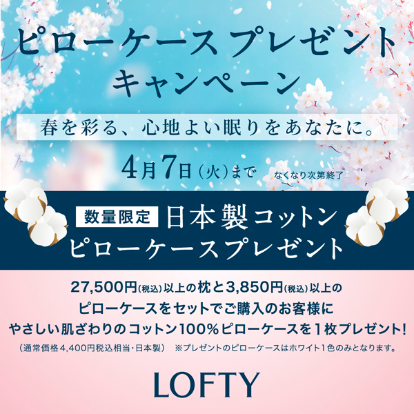 5階=〈ロフテー〉枕工房で、27,500円(税込)以上の枕と3,850円(税込)以上のピローケースをセットでご購入いただいたお客様にやさしい肌ざわりのコットン100%ピローケースを1枚プレゼントいたします!※なくなり次第終了いたします。