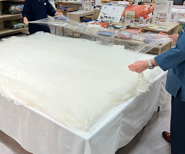 近江から職人が来店し、まわたを一枚一枚丁寧に引き延ばす手挽きの技を実演いたします。受け継がれる匠の技と、まわたふとんの魅力を間近でご体感ください。