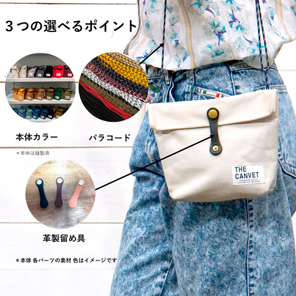サコッシュの本体カラー、パラコード、革製留め具をお好きなカラーでカスタマイズしていただけます。