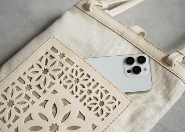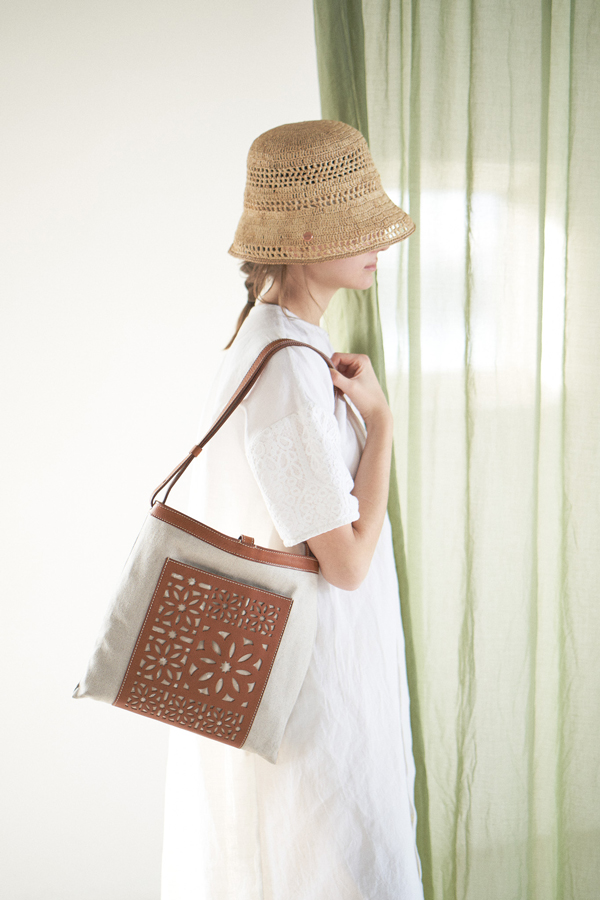 リネンの軽やかなシャリ感が特徴で、汚れにくい素材特性を持つ「ペクチン」を含み抗菌作用や静電気防止効果により日常使いにも安心です。前ポケットには花模様のカッティングを施し、軽快かつ上品な印象に仕上げました。無駄をそぎ落としたシンプルなデザインが、この季節の装いを爽やかに彩るバッグシリーズです。