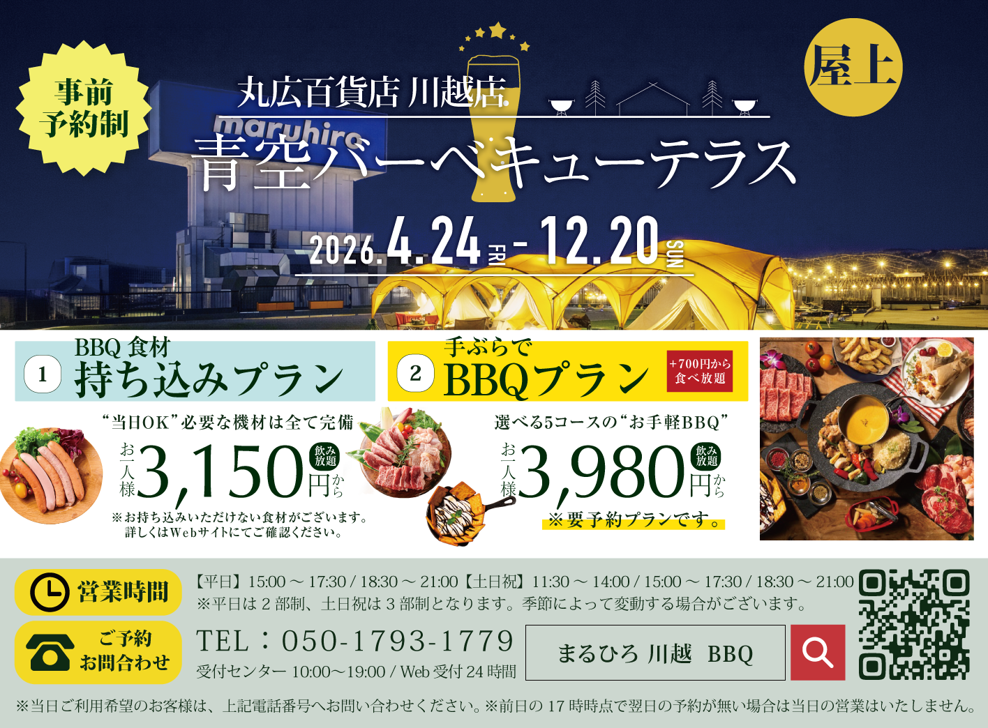 丸広百貨店川越店青空バーベキューテラスは、手ぶらアウトドアBBQが楽しめる、開放的な屋上BBQ空間です。BBQとグランピング気分を味わえる4つのBBQ&グランピングコース(1名様3,980円〜/キッズプランあり)をご用意。初めての方やアウトドア初心者の方でも安心してご利用いただけるよう、メニュー・設備ともに充実した環境を整えています。さらに+700円〜で選べる食べ放題プランの追加も可能です。
