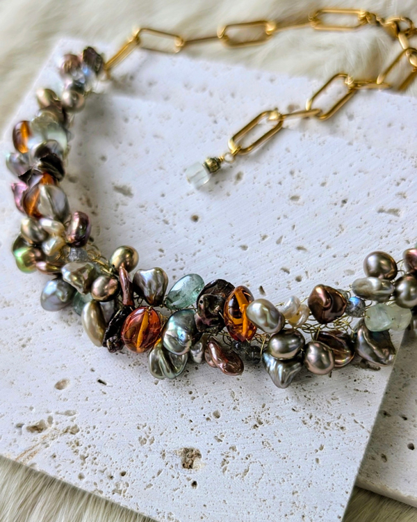 色々なグリーン色の天然石をワイヤーに通して、丁寧にかぎ針編みで仕上げたネックレスです。所々に入ったまろやかな琥珀が、襟元に上品な華やかさを演出してくれます。ネックレスのバック部分は、お肌に優しいサージカルステンレスチェーンで仕上げてあり、長さの調節もしやすくなっております。