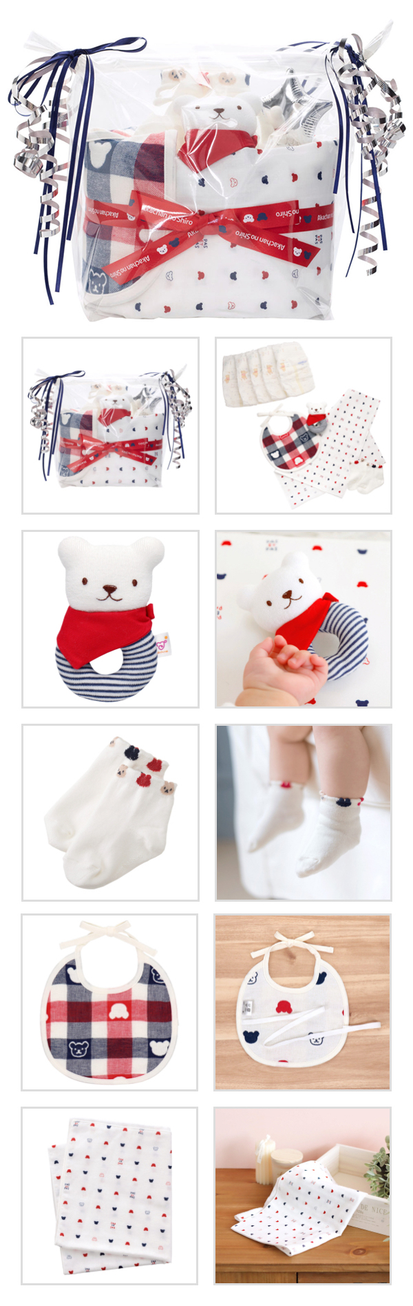 トリコロールカラーのかわいいくまさんのギフトセットです。華やかなオムツケーキは男女問わないデザインと充実のセット内容になっています。