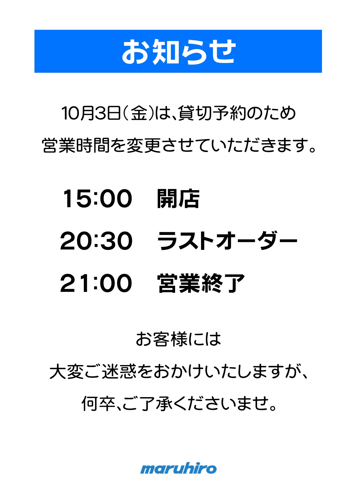 別館2階「西櫻亭」10月3日(金)営業時間変更のお知らせ