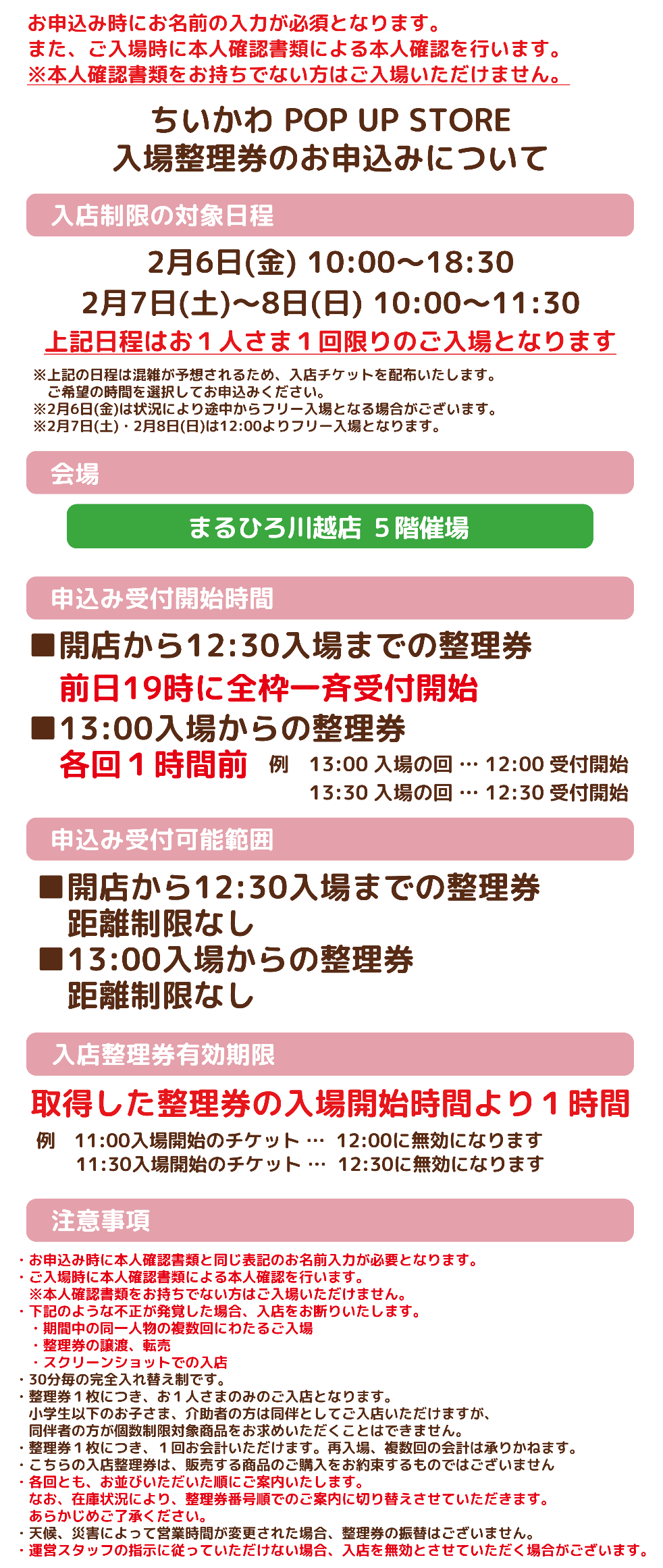 ■詳細については以下URLからご確認をお願いいたします。 https://chiikawa-info.jp/p26/pus_mhkg/ ・ ■入店制限対象日時のご案内※下記日時のご入場には、事前に入場整理券を取得いただく必要がございます。 ・2月7日(土)~8日(日) ※10:00~11:30までのご入場には入場整理券が必要となります。※2月7日(土)・8日(日)は12:00よりフリー入場となります。 ※上記入場整理券対象日時にご入場希望のお客様は、事前に「LINE デジタルチケットモギリーの整理券」が必要です。 ※上記の対象日時以外にも、フリー入場時に混雑した場合は入場制限を行う場合がございます。予めご了承ください。 ・ 入場整理券予約サイトはこちら ・ ■入場整理券のお申込みについてのご案内入場整理券予約サイトはこちら 詳細はこちらをご覧ください。 ・