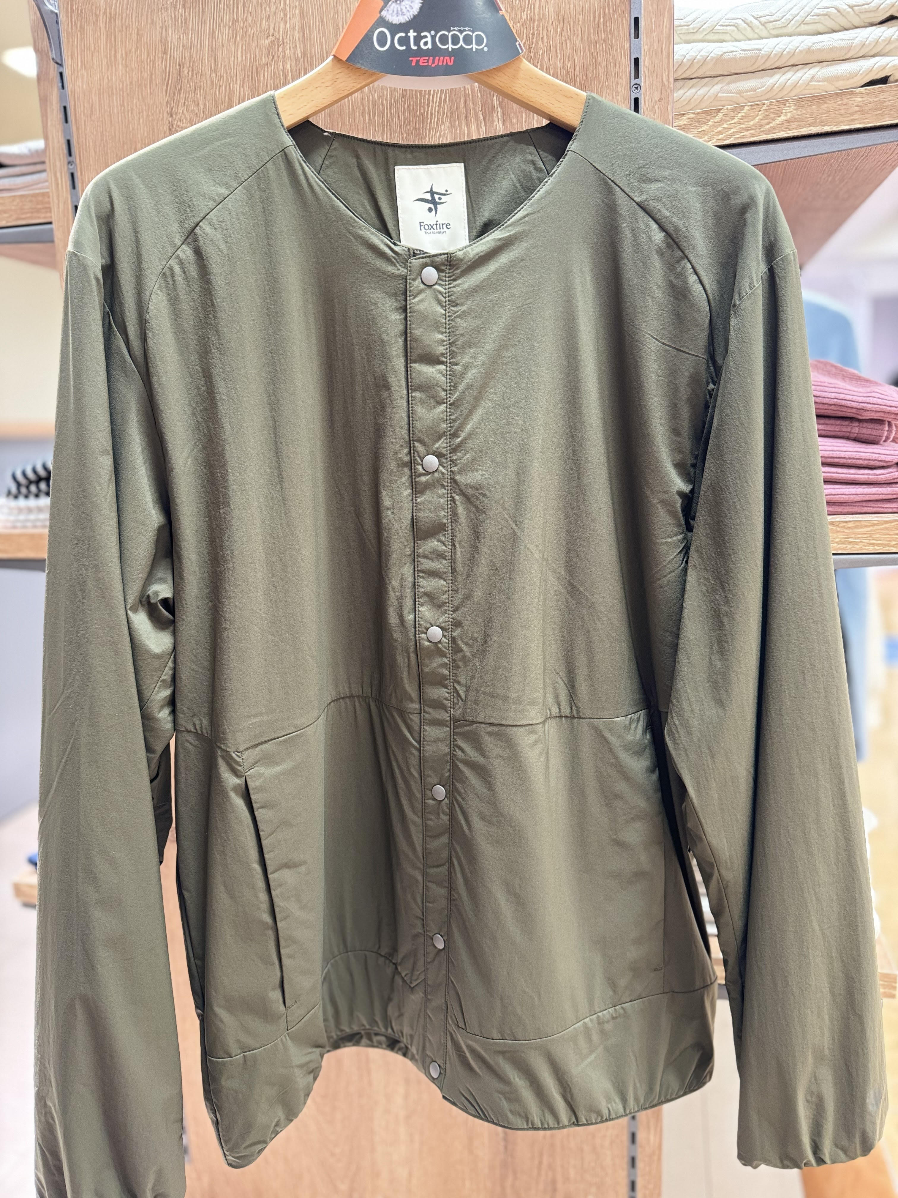 中綿と裏地を一体化した高機能トリコット生地「オクタCPCP」をライニングした、ノーカラーデザインのウィンドシェルジャケットです。軽量かつ高い保温性を実現、通気性にも優れています。