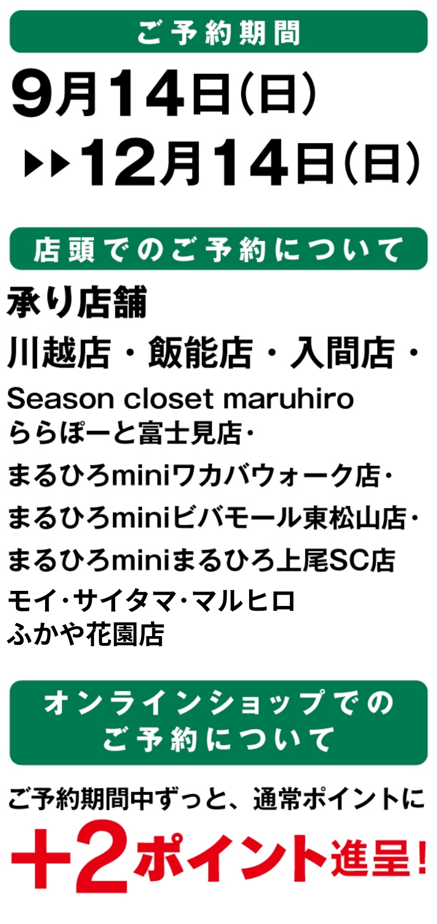 ■10月20日(月)~12月22日(月)            開催店舗: 川越店 . 飯能店 . 入間店 . 上尾SC . まるひろ南浦和SC . Season closet maruhiro ららぽーと富士見店