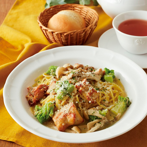ポルチーニや、たまり醤油などを使用したコクのあるクリームソースに、ローストチキンと舞茸、しめじ、ロマネスコを合わせました。