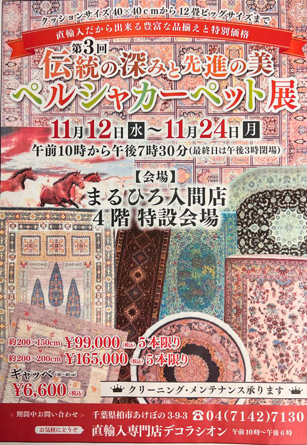 華麗にして優美な最高級手織りペルシャカーペットから気軽に楽しめるギャッベまで、特別価格にて取り揃えております。また、絨毯のクリーニング・メンテナンスなど、お気軽にご相談お問い合わせください。