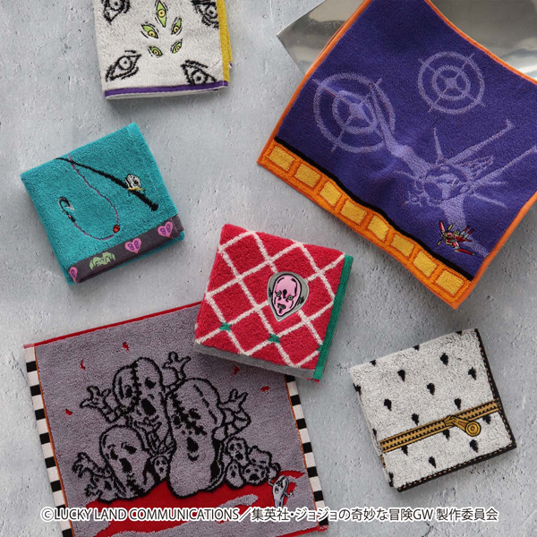 『ジョジョの奇妙な冒険』の世界観やキャラクターをデザインしたハンカチやポーチ、エコバッグをご紹介しております。タオルハンカチ...税込1,100円ポーチ...税込3,300円エコバッグ(ケース付き)...税込4,400円