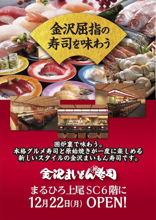 本格グルメ寿司と原始焼きが一度に楽しめる、新しいスタイルの金沢まいもん寿司です。