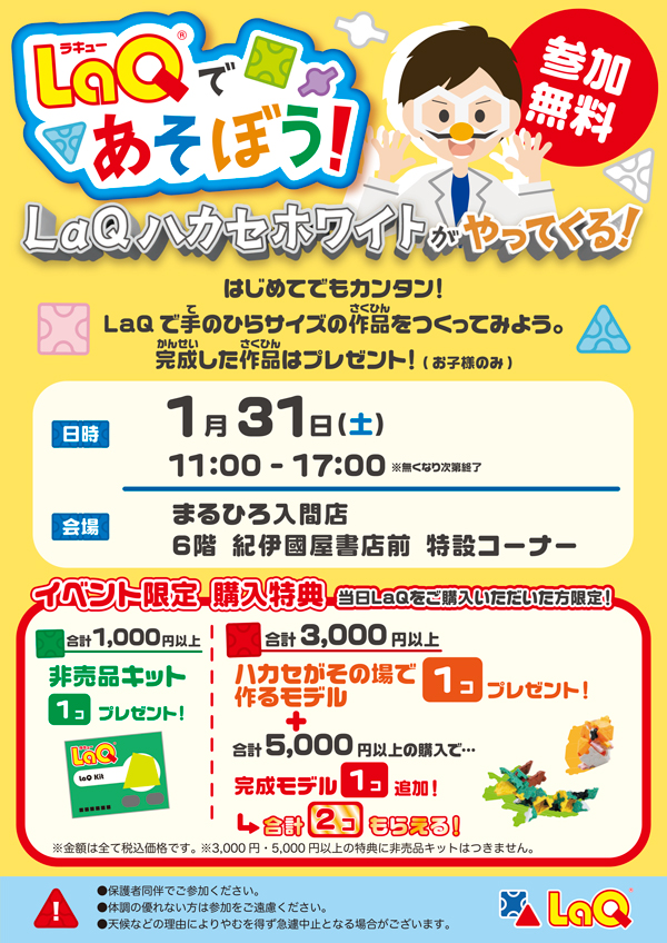 遊んで学ぶ。子供をはぐくむ日本製パズルブロック「LaQ(ラキュー)」で遊ぼうイベントを開 催!当日は、ハカセホワイトが登場!!立体の作品作りを体験できます。ぜひご来場をお待ちいたして おります。