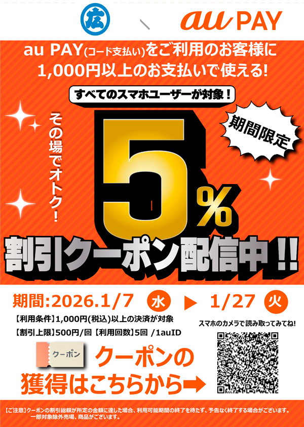 ※必ず事前にクーポンを獲得いただき、au PAY(コード支払い)にて1会計・税込1,000円以上お支払いください。お支払い完了後にクーポンを使用することはできません。