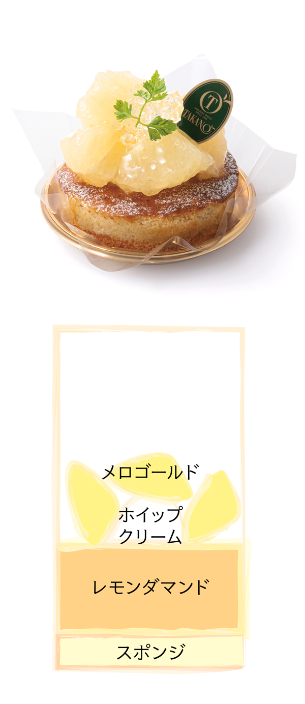 レモン風味のダマンドに季節のフルーツ、メロゴールドを飾りました。