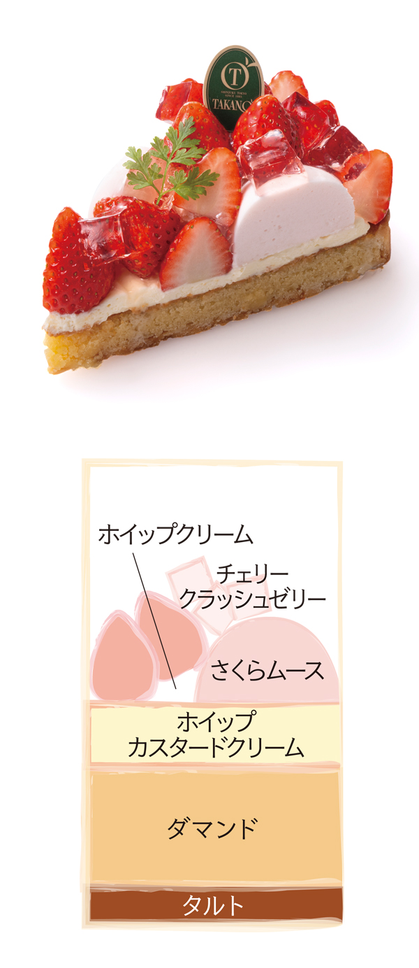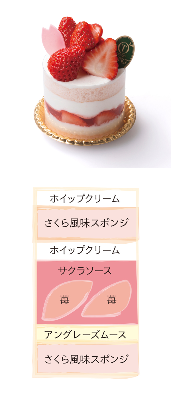 さくら風味のスポンジでアングレーズムース、苺、サクラソース、ホイップクリームをサンドしたケーキ。
