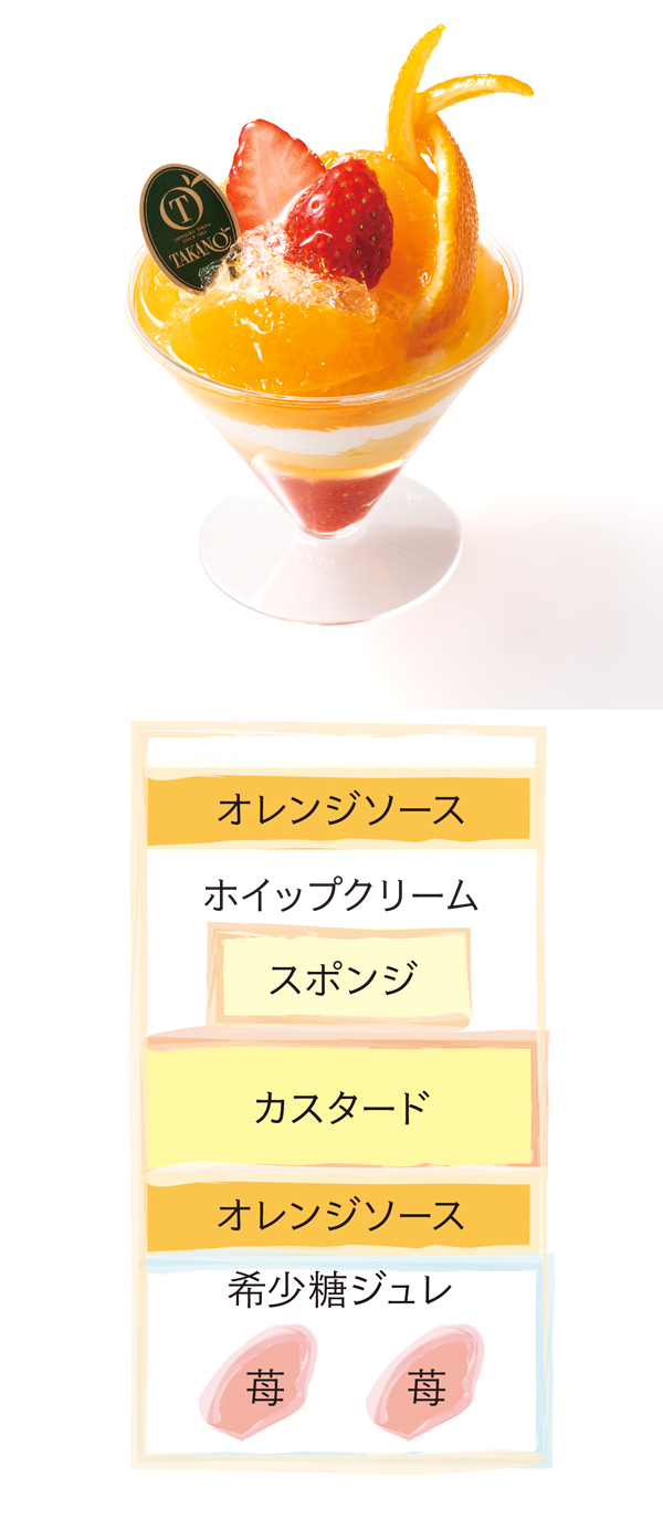 オレンジソースやカスタードにスポンジとホイップを重ね、せとかと苺を飾った季節のパフェ。
