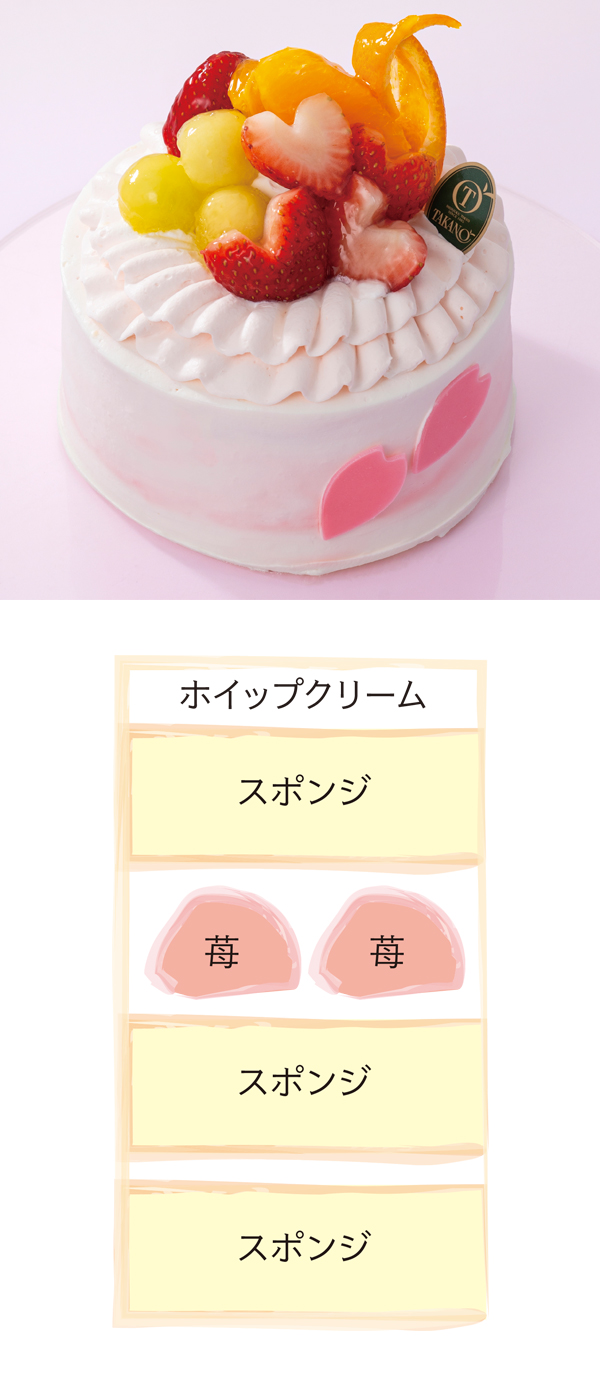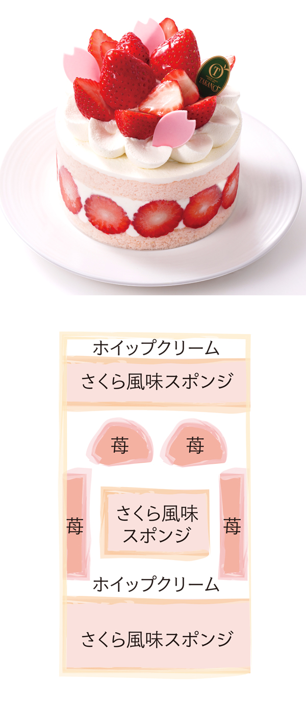 苺をさくら風味のスポンジでサンドした季節のデコレーションケーキ。