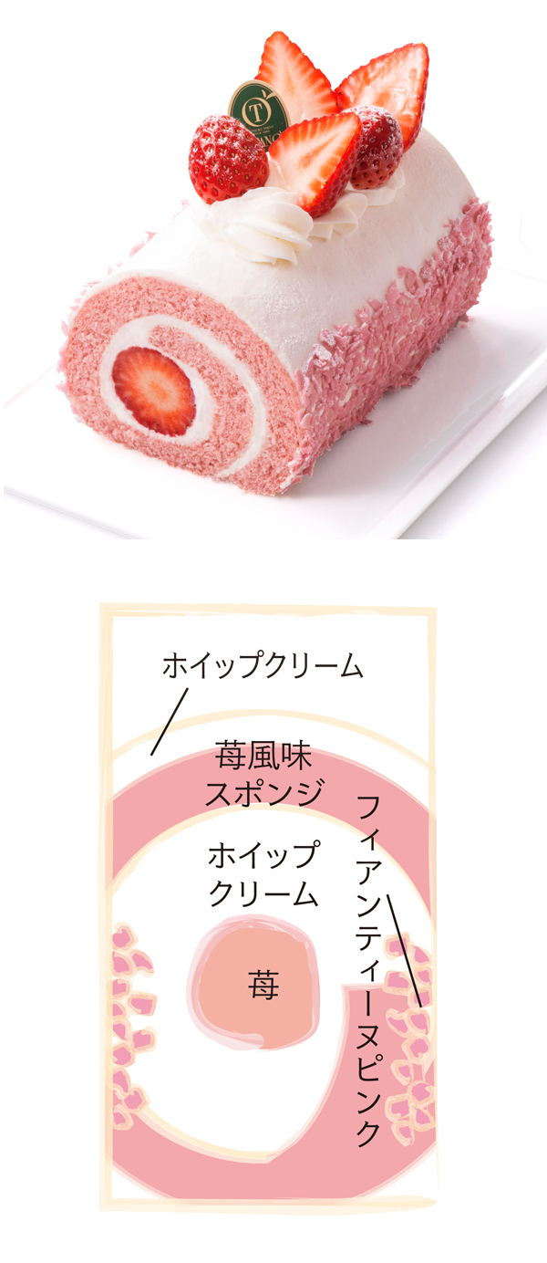 苺風味のスポンジで巻いたロールケーキに苺を可愛いらしくトッピング。