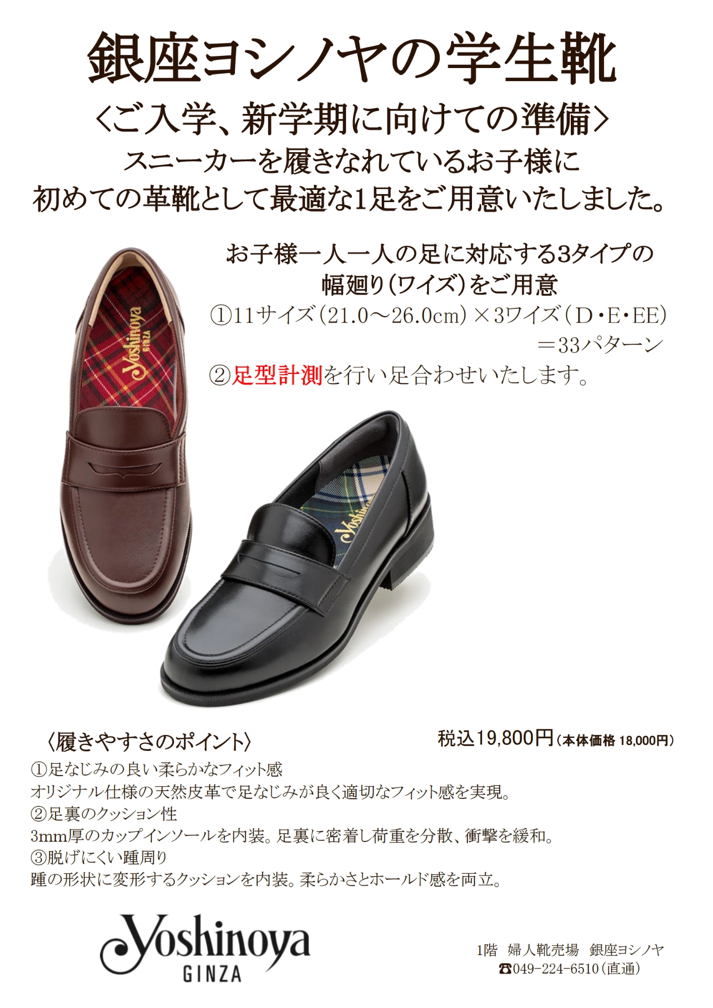 「ご入学、新学期に向けての準備」スニーカーを履きなれているお子様に初めての革靴として最適な1足をご用意いたしました。毎日の通学に欠かせないローファー。初めてのローファーは足にやさしく歩きやすいのがおススメです。〈銀座ヨシノヤ ローファー〉〈イング ローファー〉をぜひお試しくださいませ。