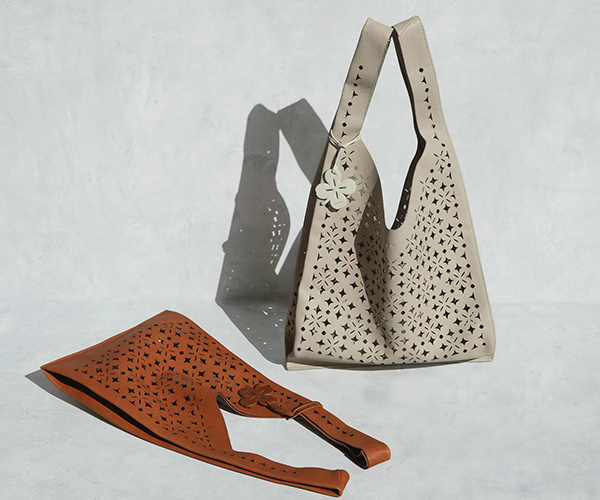 春らしく軽やかな印象でお持ちいただける、カットワークが美しい薄型レザートート。幸運の象徴である四つ葉のクローバーをモチーフに、カットワークによる模様を施しました。春から夏にかけての装いに、軽やかな抜け感を添えてくれる一品です。