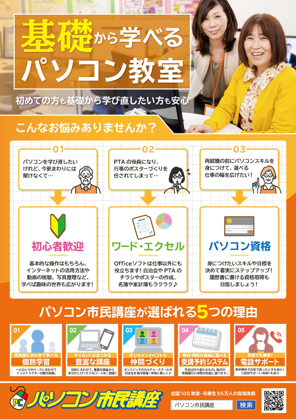タイピングの基礎や仕事の効率化・資格取得、趣味のサークルのお知らせ作成など、800以上のコースから専門のインストラクターがお客様お一人お一人の希望を伺い、コースのご案内をさせていただきます。